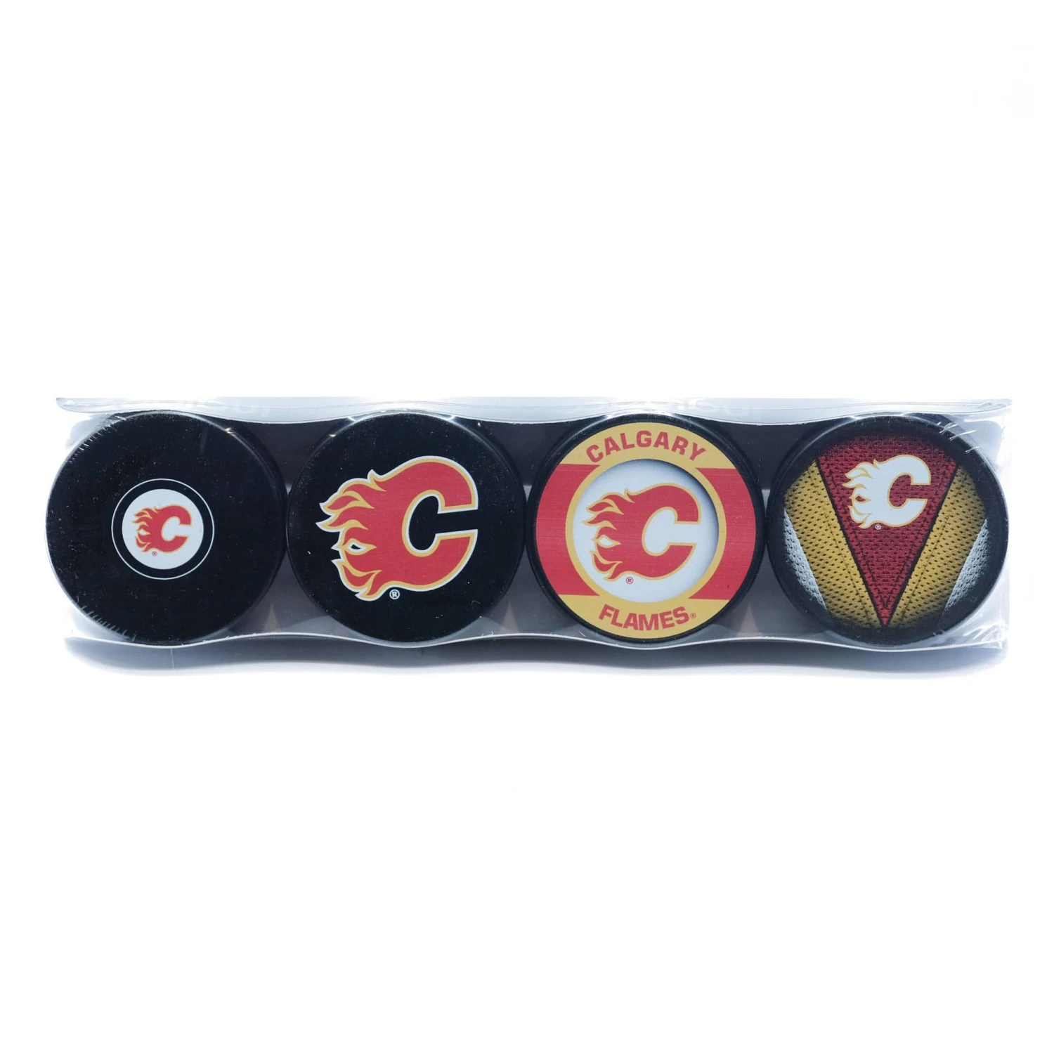 You’re a hockey fan and you should show it off. Represent your favourite NHL team in 4 different styles with the NHL Logo Hockey Puck 4-Pack. Each pack includes a basic logo puck, retro logo puck, stitch logo puck, and autograph logo puck.Â