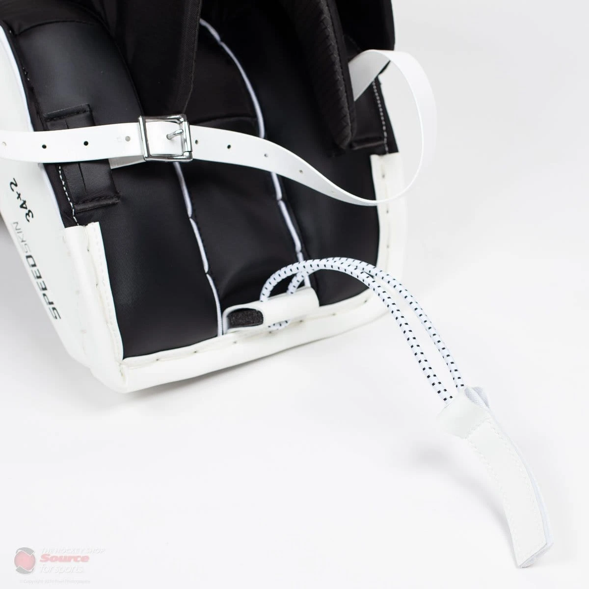 The E4.9 is wrapped in speedskin, enabling a smoother transition on the ice to increase speed and energy transfer. Speekskin was introduced in 2017 with the E-flex 3 pro pads and has became a mainstay on CCM pads now as their skin of choice.