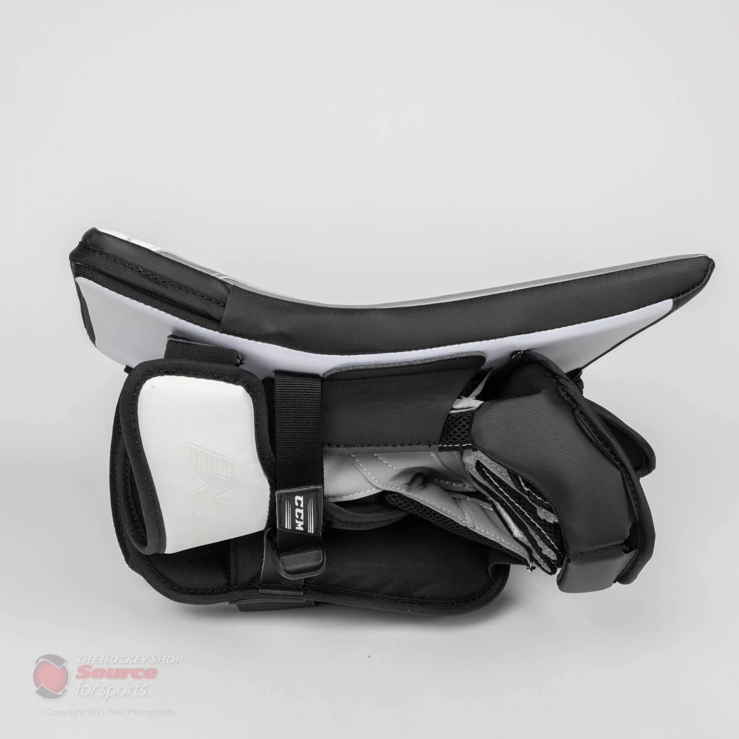 The CCM E5.5 blocker is wrapped in CCM’s proprietary SpeedSkin material. SpeedSkin on a blocker doesn’t have the same slide benefit as it does on pads. However, it is a lighter material than traditional Jenpro, and keeps the material consistent throughout a goalie’s entire setup.