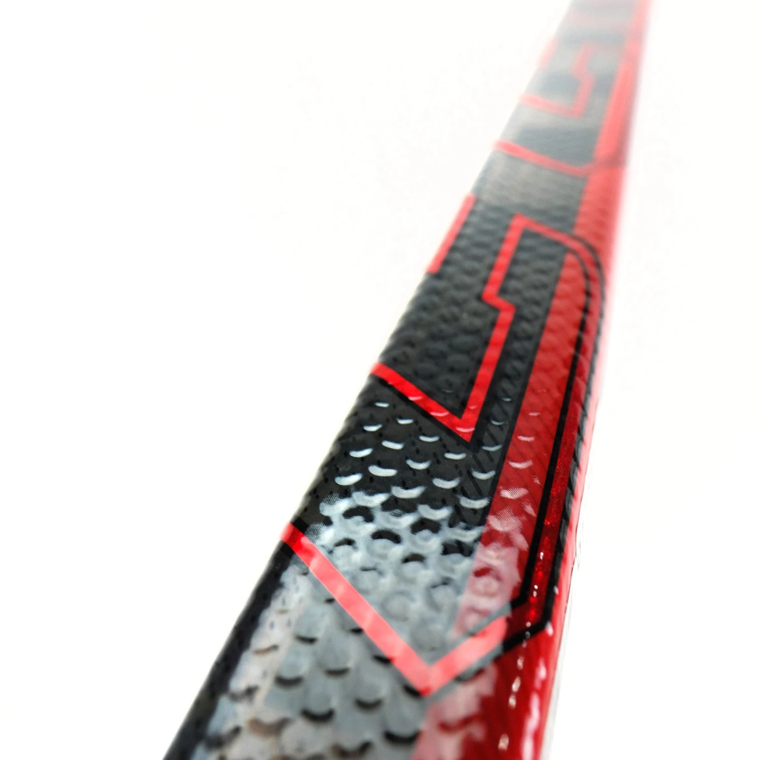 This custom CCM Jetspeed FT4 Pro Stock Senior Hockey Stick offers a few key features that differentiate itself from the original Jetspeed FT4 Pro. This stick is equipped with an abrasive finish on the max height blade. the curve is a custom P19M curve and a unique toe shape that is round with a square bottom. The shaft is outfitted with a tactile grip that resembled the dimples on a golf ball.
