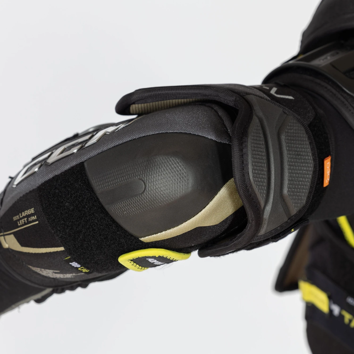 The bicep is covered by a two-piece floating, articulated and reinforced bicep guard. The two-piece construction is built to give you pro-level protection, no matter how you move on the ice.