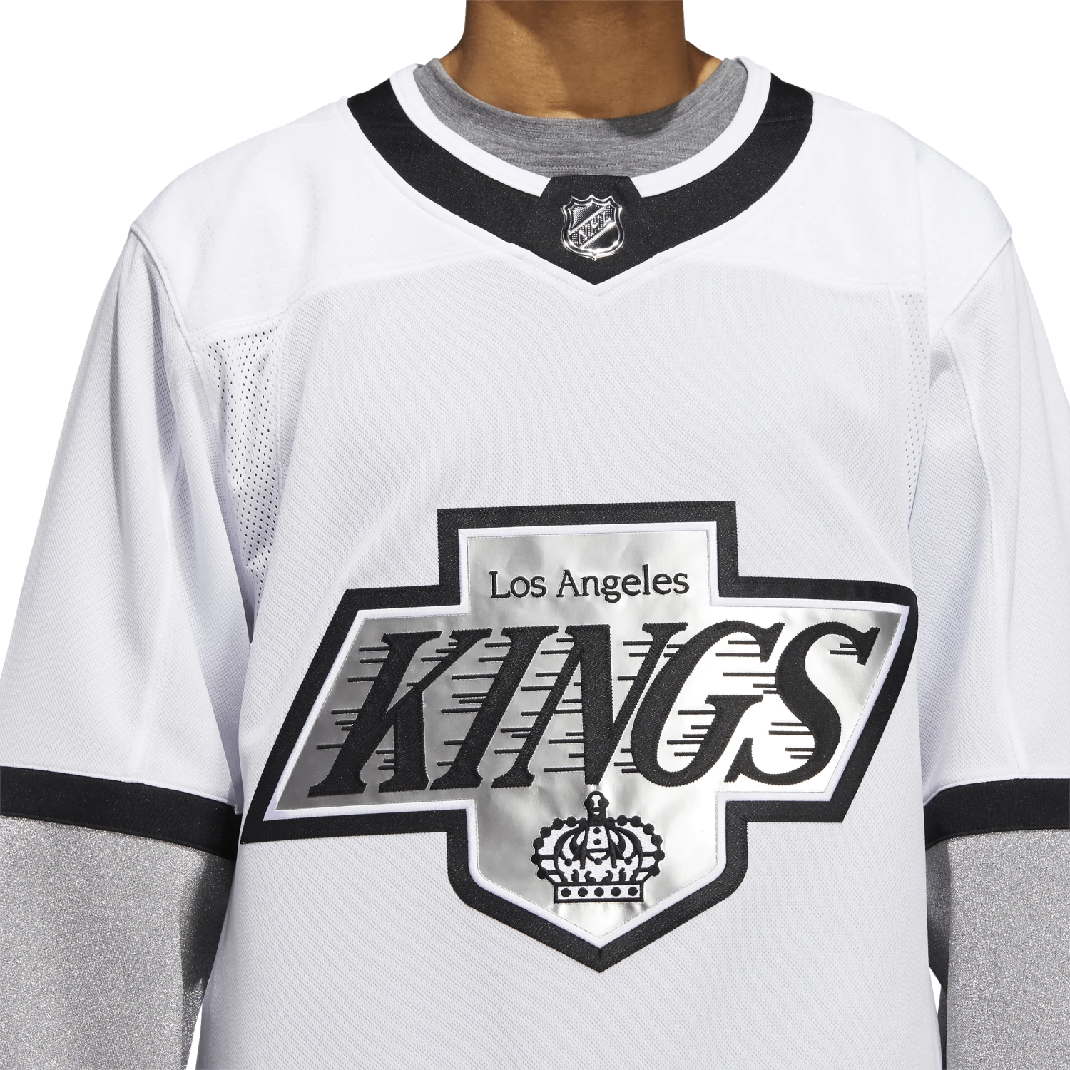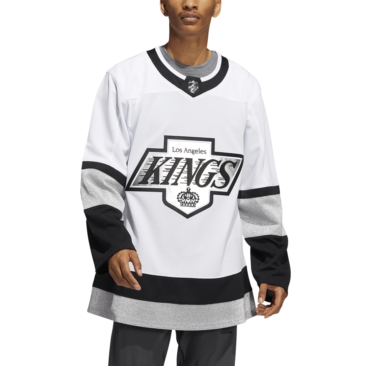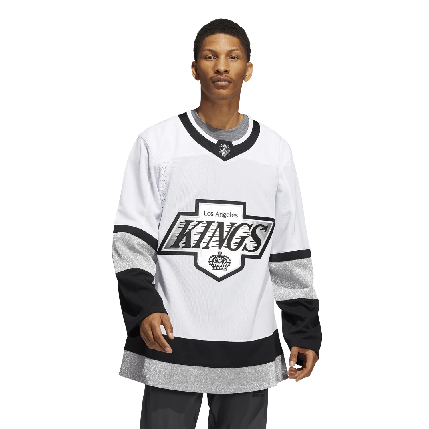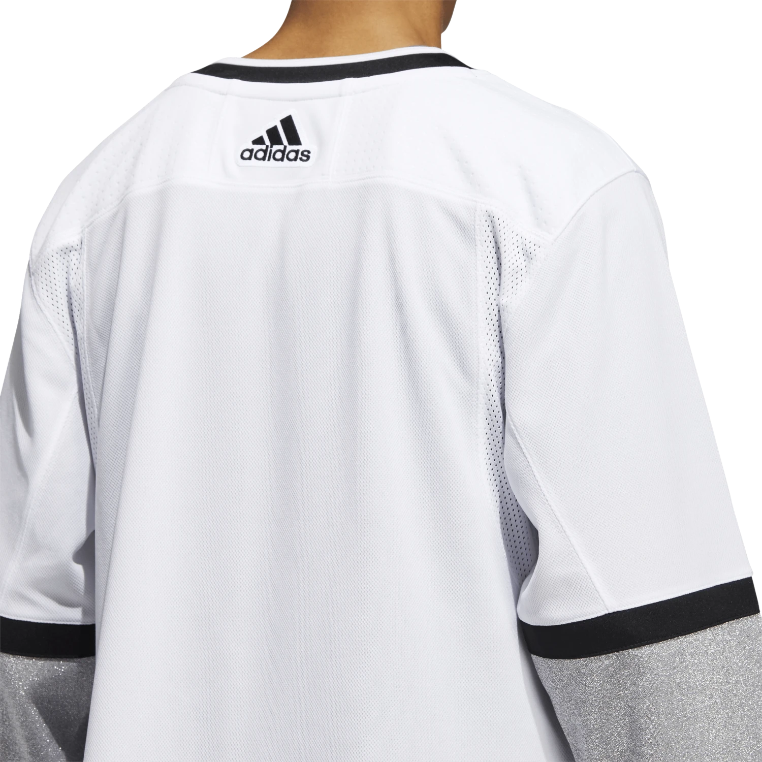 Get all your good luck gear together, pull on this Los Angeles Kings Alternate Adidas PrimeGreen Senior Jersey and cheer on your favorite team. AEROREADY keeps you cool as the Kings’ descend on the net. A mesh underarm insert adds breathability as you jump to your feet when the goal horn sounds. This product is made with Primegreen, a series of high-performance recycled materials.