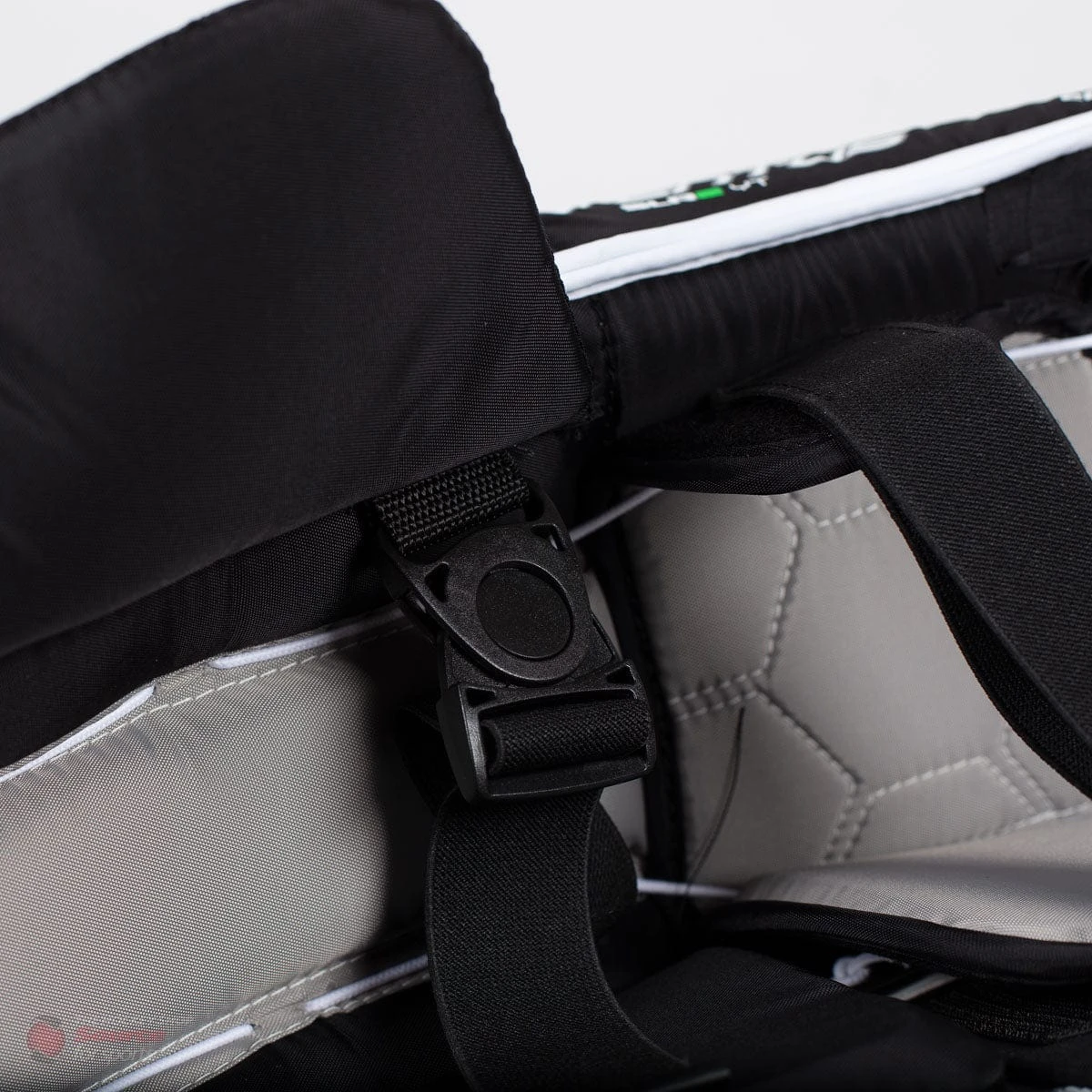 The knee cradle of the Vaughn SLR 2 keeps the goaltender secure with two key features. The angled velcro knee strap allows for a secure but free moving space for the goaltenders knee. The second key feature is the suede on the inside landing pad itself. This material limits the slip and allows goaltenders to stay more solidly on the knee stack.