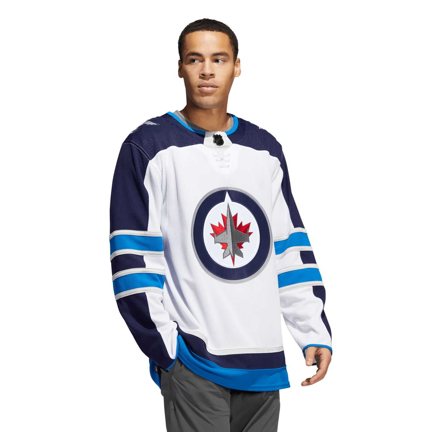 Pull on this adidas Winnipeg Jets authentic away jersey, and get the gang together for game night in your fan cave. AEROREADY keeps you cool and dry as you wait for the puck to drop at center ice. The big crest out front, shoulder patches and a fight strap with a snap closure keep the look legit. This product is made with Primegreen, a series of high-performance recycled materials.